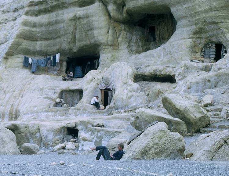 Wieść o dziwnych obcokrajowcach zajmujących jaskinie przyciągała w weekendy Greków z okolicznych wiosek i miasteczek. Zjeżdżali pod wapienne skały, by zjeść w tawernie rybę i pogapić się z satysfakcją na Amerykanów mieszkających w jaskiniach niczym przybysze z prehistorycznych czasów.