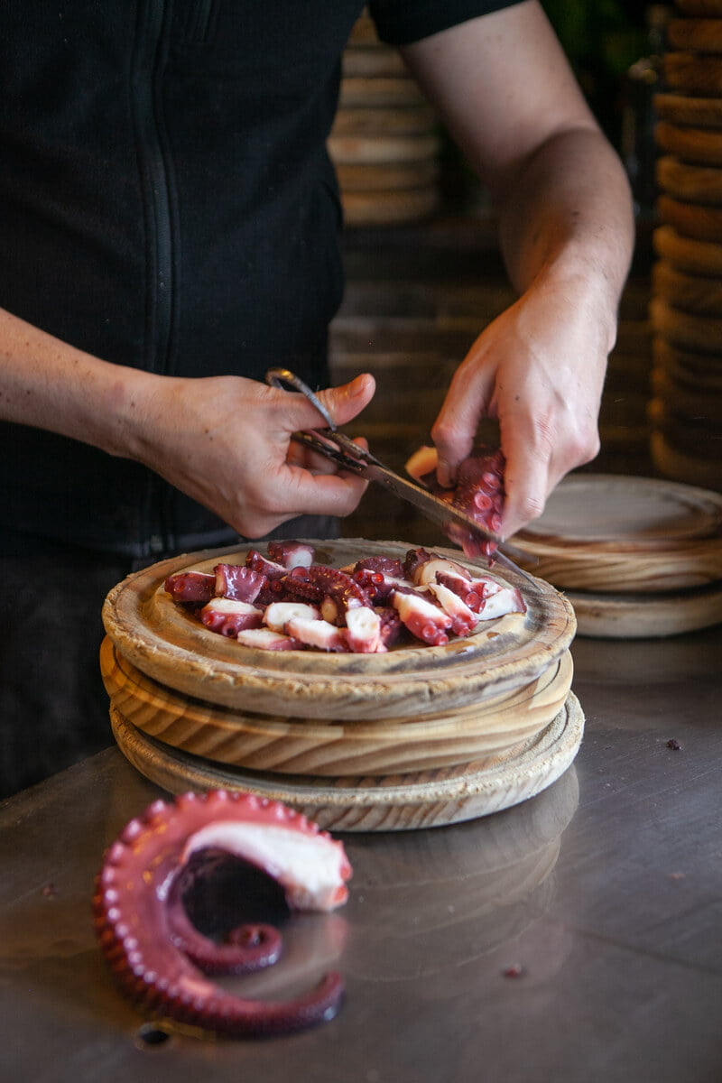 Pierwotnie ośmiornice były sprzedawane nie w restauracjach, ale przy okazji targów. Od nich wywodzi się zresztą galisyjska nazwa dania: polbo a feira, ośmiornica targowa. Sądziłam, że jest to odpowiednik hiszpańskiej nazwy pulpo a la gallega, czyli ośmiornicy po galisyjsku – tak podaje m.in. angielskojęzyczna Wikipedia. W jednej z galisyjskich pulperías dowiedziałam się, że to dwa inne dania. Różnią się jednak nie sposobem przygotowania, ale dodatkiem: okazuje się, że ośmiornicę po galisyjsku podaje się z gotowanymi ziemniakami, zaś polbo a feira z chlebem.