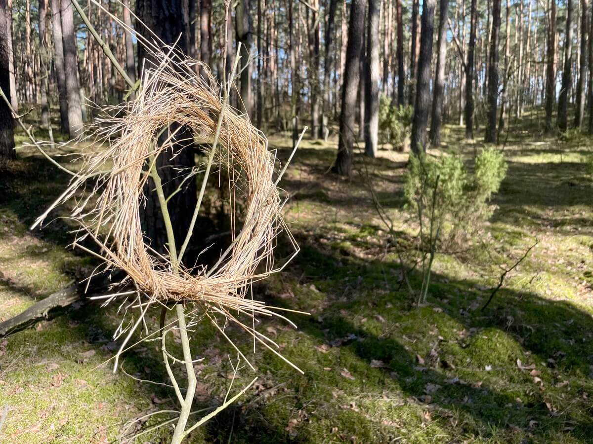 Na wiotkich gałęziach przydrożnego krzaka kołysze się z ruchem powietrza wyschnięty, żółty wianek z traw. Przez moment myślę, że to ptasie gniazdo, które ześlizgnęło się z przynależnego mu miejsca. To jednak dzieło ludzkich rąk. Miesiące temu, na długo przed nadejściem zimy, ktoś splótł wiązki soczystych traw, tworząc z nich równy krąg. Czy jakaś dziewczynka niosła go przez las na głowie? Czy uplotło go dziecko, dorosły, wróżka? I czy ktoś znudzony swym dziełem rzucił je w końcu na gałęzie krzaka? A może ten wianek niepostrzeżenie wymknął się z dłoni i spadł na drogę i dopiero później, kolejny spacerowicz natknął się na niego i powiesił na wysokości oczu, tak by ewentualny poszukiwacz mógł odnaleźć zgubę?