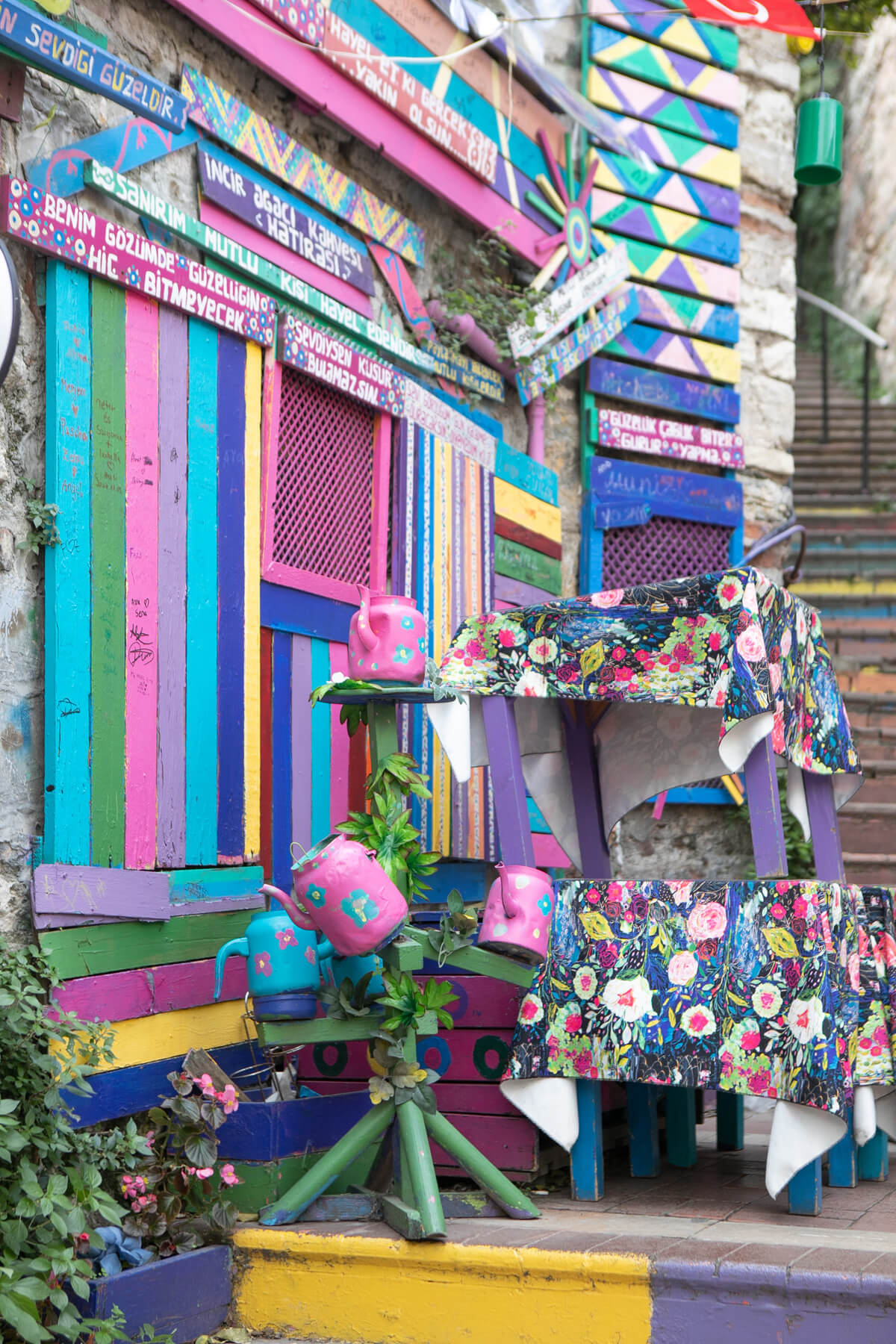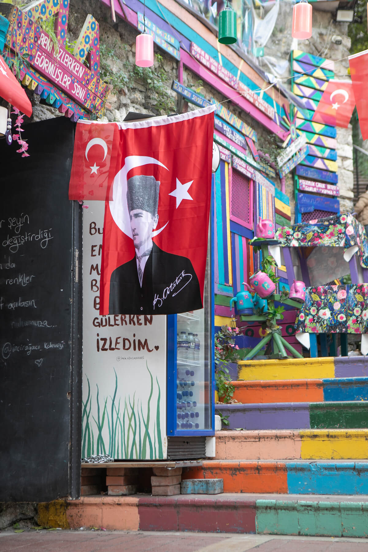 Dalej mijam knajpę, która wygląda, jakby została stworzona wyłącznie na potrzeby Instagrama. Kolejne osoby robią sobie zdjęcia na tle kolorowych desek i pomalowanych imbryczków. Taki zakątek mógłby się pojawić w dowolnym miejscu na Ziemi. O tym, że jesteśmy w Turcji przypominają niezliczone tureckie flagi, niektóre z wizerunkiem Atatürka. Czuję, że dałam się nabrać – że słynne schody i ich okolica to tylko wydmuszka, chociaż sama nie wiem, jakiej głębi historycznej się spodziewałam. Tuż obok jest patio, które również, jak w wielu miejscach na świecie, udekorowano rozwieszonymi parasolami. Gdy tylko pod nie wchodzę z aparatem, ktoś natychmiast mnie wyrzuca. To miejsce wyłącznie dla klientów i tylko oni mogą robić zdjęcia.