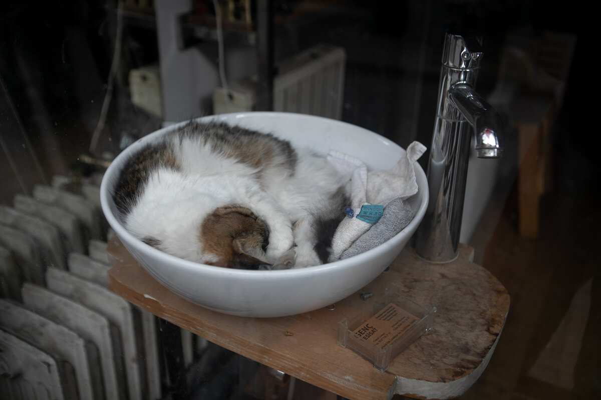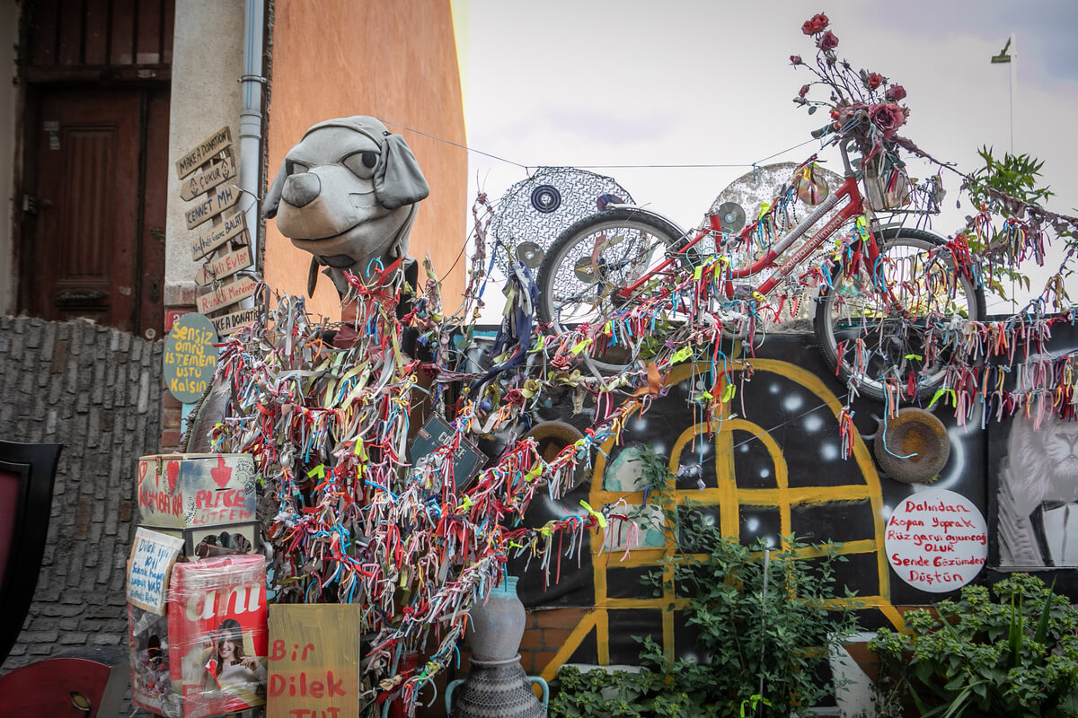 O opłatę za zdjęcia proszą też twórcy przedziwnej instalacji na ulicy nieopodal. Jest tu manekin w poszarzałej sukni ślubnej, zdezelowany motocykl przewiązany kolorowymi szmatkami, stare fotele, na których można przysiąść. Po drugiej stronie zardzewiały rower, wielka głowa psa z plastiku oraz mnóstwo wstążeczek. I informacja, że pieniądze za sfotografowanie tej dziwacznej scenografii przeznaczane są na jedzenie dla bezdomnych zwierząt. Bezdomne psy i koty faktycznie można tu spotkać – choć po regulacjach wprowadzonych przez prezydenta Erdogana w całym Stambule jest ich znacznie mniej niż kilka lat wcześniej. Idea jest więc słuszna, ale miejsce nieco przerażające.