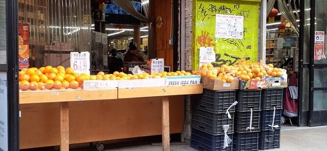 Na Chinatown udało mi się znaleźć punkt, w którym kręcono scenę postrzelenia Vito Corleone. Grana przez Marlona Brando głowa mafijnej rodziny kupuje na ulicznym straganie owoce, gdy pojawia się dwóch zabójców i oddaje z bliska serię strzałów. Ranny Vito przewraca się, potrącając wiadro z pomarańczami, które rozsypują się po ciemnym asfalcie ulicy (kamera patrzy na to z góry). Dziś w miejscu, w którym Vito kupował owoce jest apteka, ale dokładnie naprzeciwko, po drugiej stronie ulicy zauważyłem… stoisko w pomarańczami!