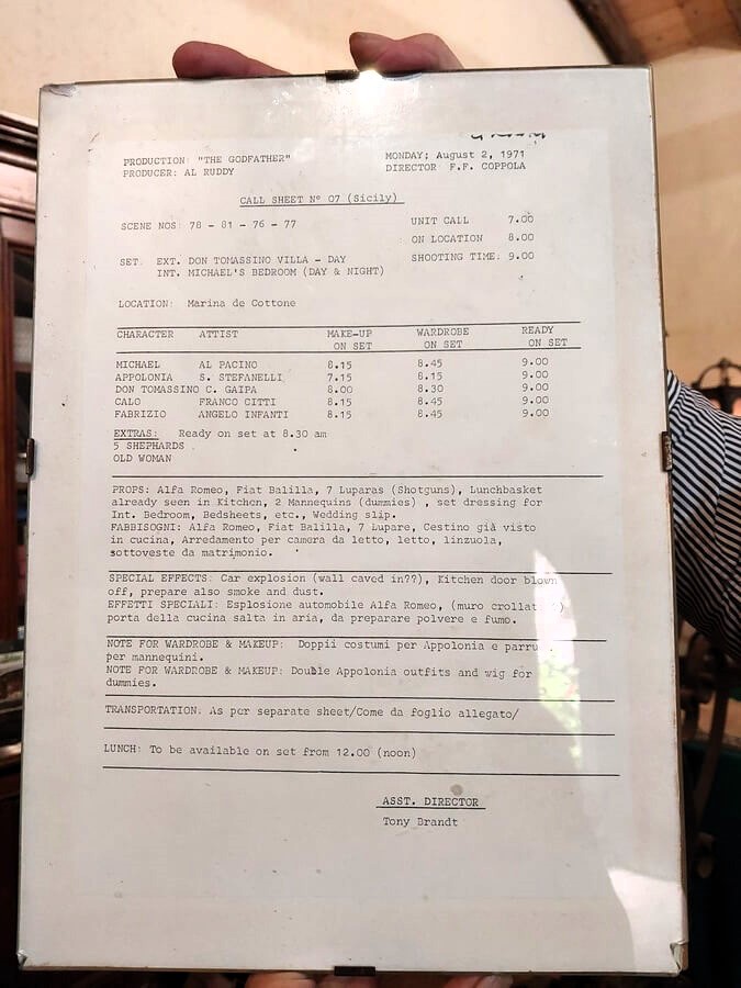 Podróżując po wschodniej Sycylii, udało mi się dostać do Castello degli Schiavi, rezydencji, w której – uwaga, spoiler – umiera Michael Corleone (zamek wykorzystano także przy kręceniu drugiego sezonu „Białego lotosu”). Zasiadłem na oryginalnym – jak upiera się właściciel domu, sycylijski baron – krześle, na którym miał siedzieć Al Pacino, a przemierzając posiadłość podziwiałem zdjęcia i dokumenty. Dumny właściciel puścił w telewizorze zmontowane fragmenty z trylogii „Ojca Chrzestnego” – wszystkie, oczywiście, przedstawiające jego posiadłość. Widząc moje zainteresowanie, podsuwał kolejne zdjęcia, autografy czy plany dnia Coppoli.